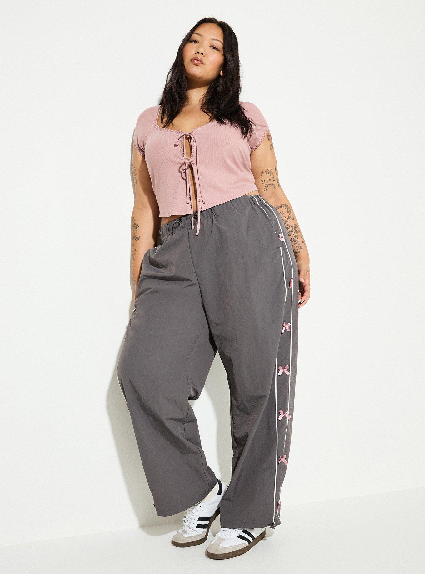 sporty & cutesy... no running required! FIT adjustable stoppers at waist and leg openings. 31'' inseam. MATERIALS + CARE nylon woven fabric. 100% nylon. machine wash cold. tumble dry low. imported. DETAILS pull-on design. side piping details. side bow details. LOVESICK the vibes are high and the ‘fits are iconic. salty hair, always. weekend plans, locked. car windows, down. POV: you’re living your best life in lovesick.