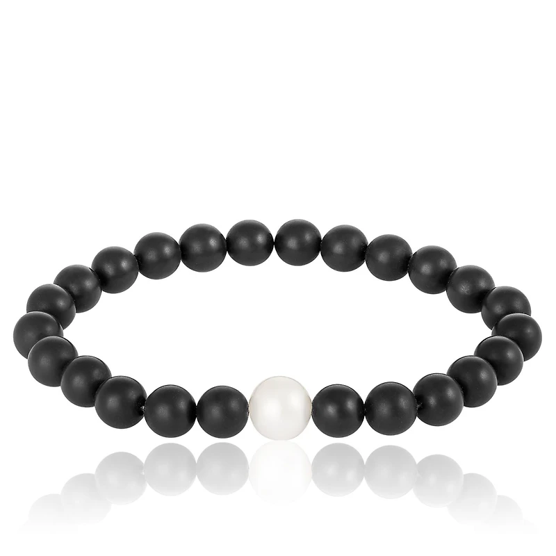 Strong black onyx combined with a delicate pearl creates an elegant bracelet with a feminine feel yet with a masculine look. 9-10mm black onyx and a white pearl accents this exceptional bracelet.