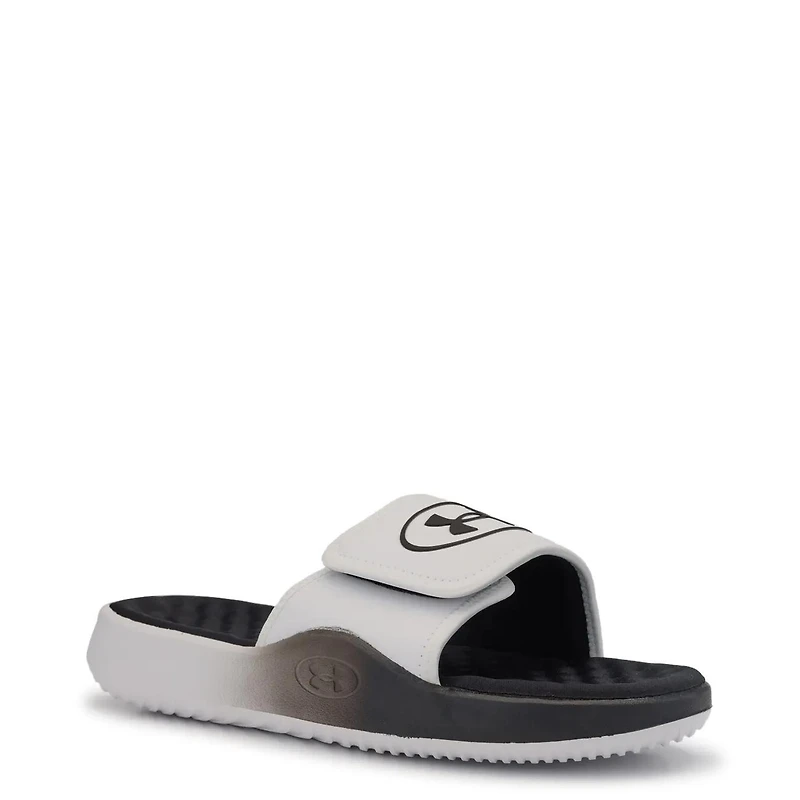 Men’s Under Armour Ignite Pro 8 slide sandal delivers easy comfort for recovery days and everyday wear. Designed with a lightweight synthetic upper, this slide features a hook and loop closure for an adjustable, secure fit. The textured footbed is cushioned for step‑in comfort, while the EVA midsole and outsole provide lightweight support and flexibility. A sporty logo detail finishes off this versatile slide, perfect for post‑workout or casual use.