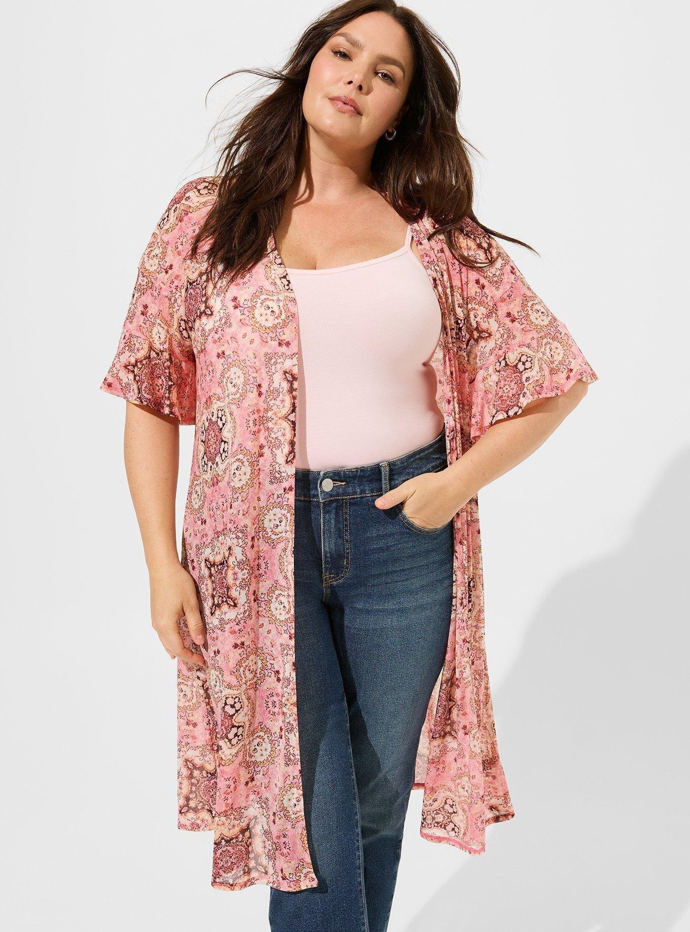 FIT Measures 48'' from shoulder (size 2). MATERIALS + CARE Mesh knit fabric. 96% nylon, 4% spandex. Machine wash cold. Dry low. Imported. DETAILS Open front. Tiered ruffle sleeves.