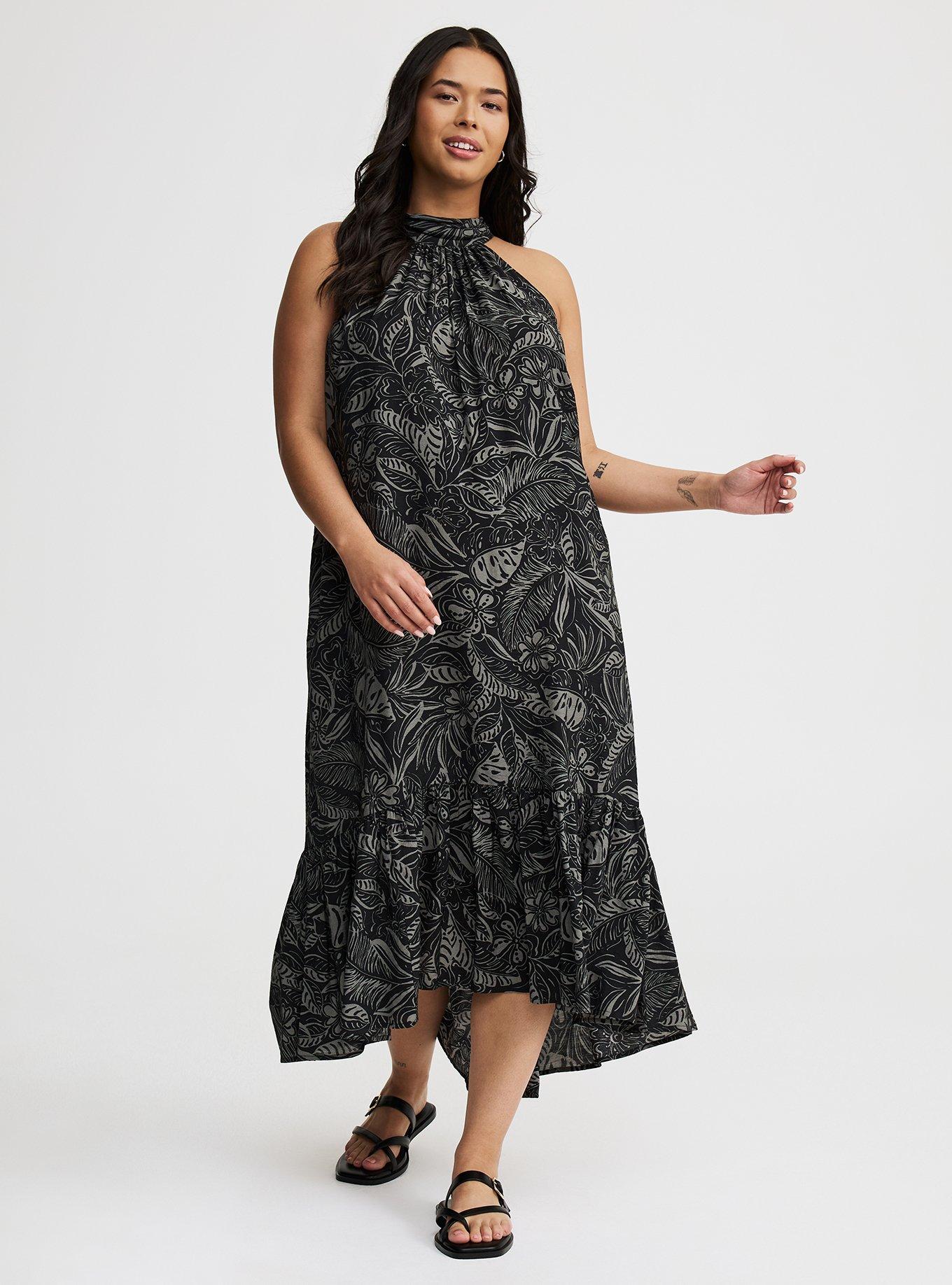 FIT Measures 50'' from shoulder (size 2). Midi length. MATERIALS + CARE Hammered rayon knit fabric. 80% viscose, 14% polyester. Wash cold. Tumble dry low. Imported. DETAILS High neckline. Tie back detail. Ruffled hem.
