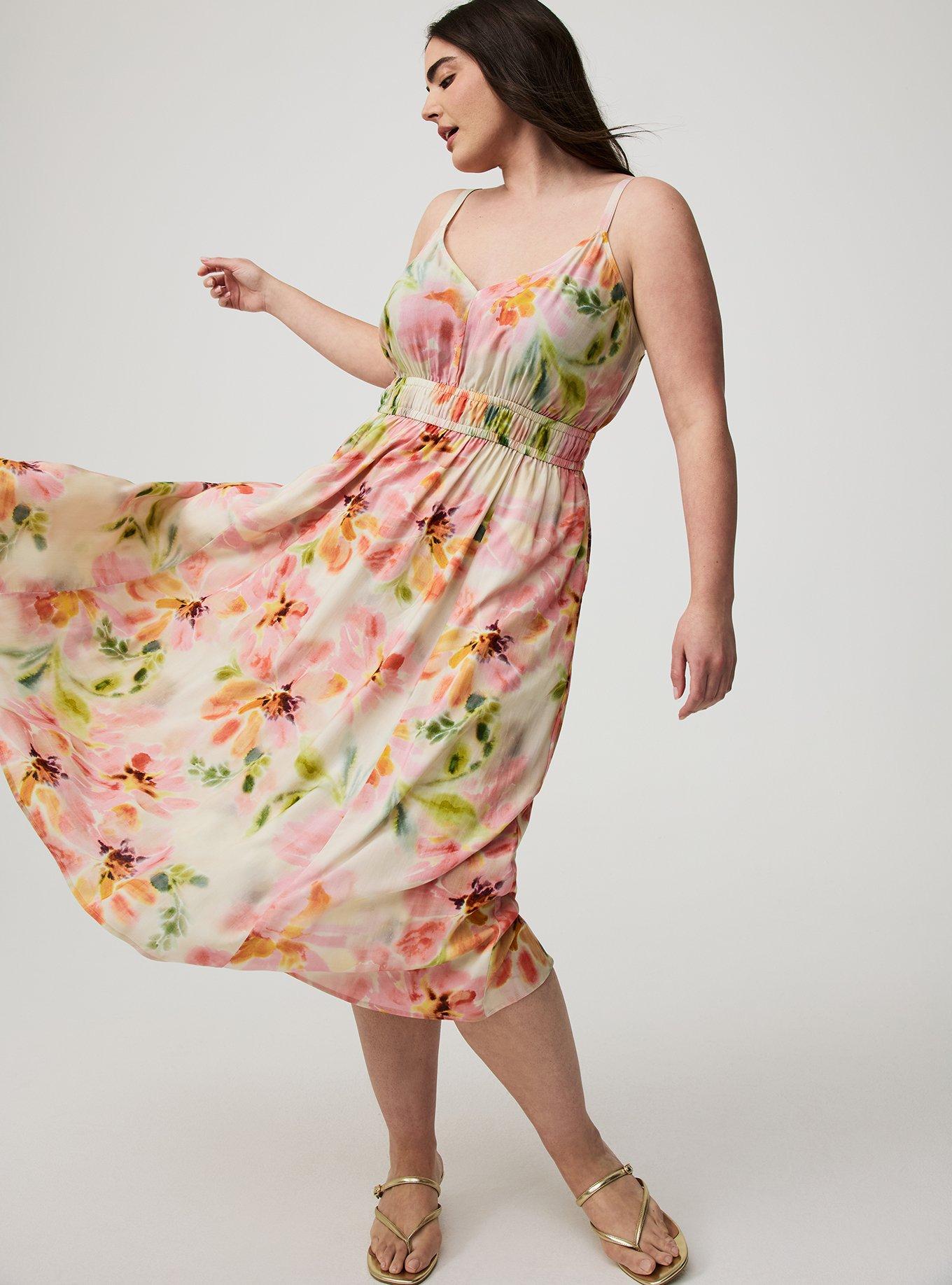 FIT Measures 50'' from shoulder (size 2). Midi length. MATERIALS + CARE Challis woven fabric: New, improved, and loved by all—and still lightweight, drapey, and (really!) machine-washable. Stretch level: None. 72% viscose, 28% lyocell. Machine wash cold. Tumble dry. Imported. DETAILS V-neckline. Sleeveless. Adjustable straps. Smocked waist. Back cutout detail. Functional pockets.