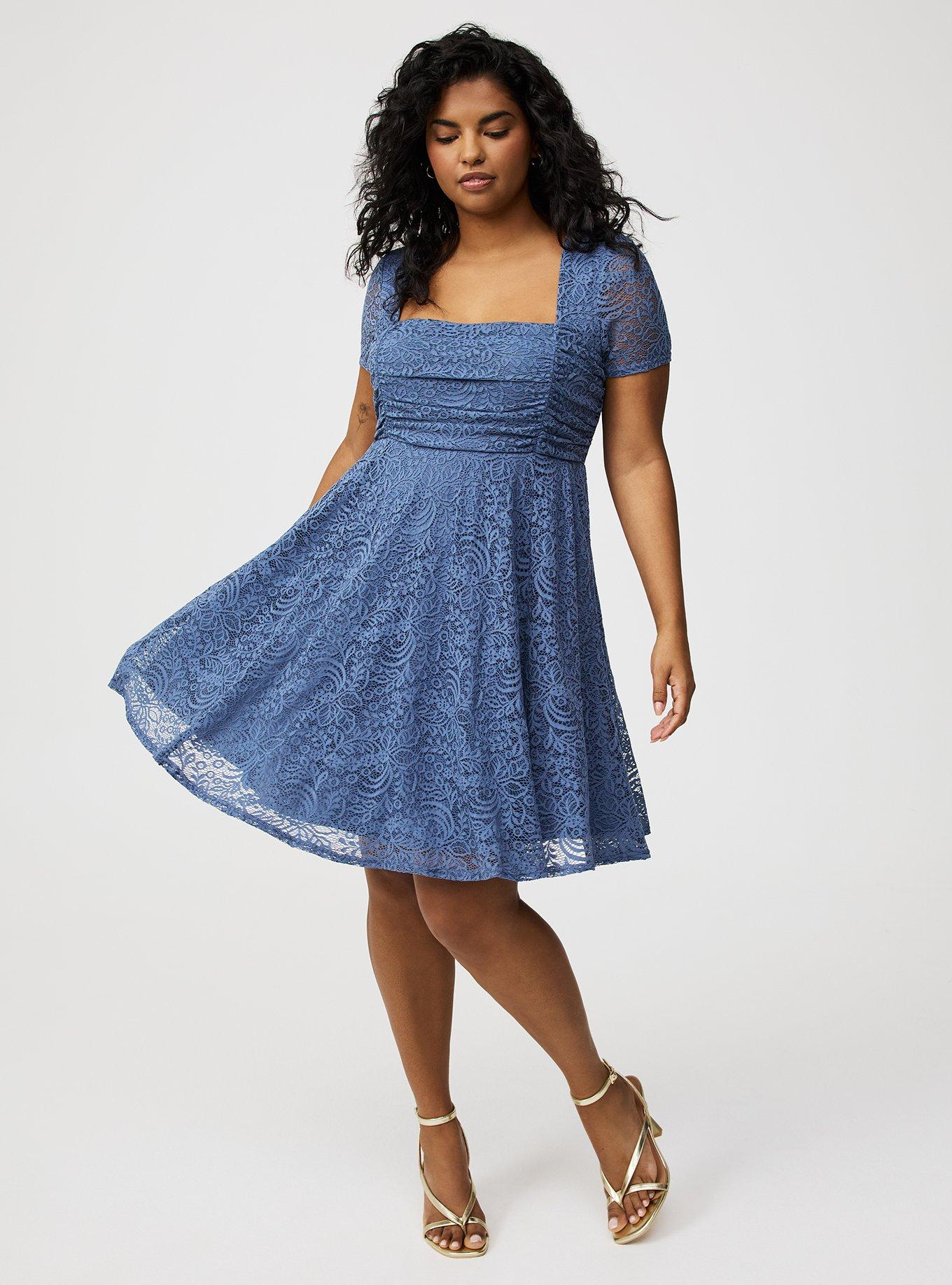 FIT Measures 40'' from shoulder (size 2). Mini silhouette. MATERIALS + CARE Stretch lace knit fabric. 90% nylon, 10% spandex. Machine wash cold. Tumble dry low. Imported. DETAILS Square neckline. Short sleeves. Ruched bodice. Functional pockets.