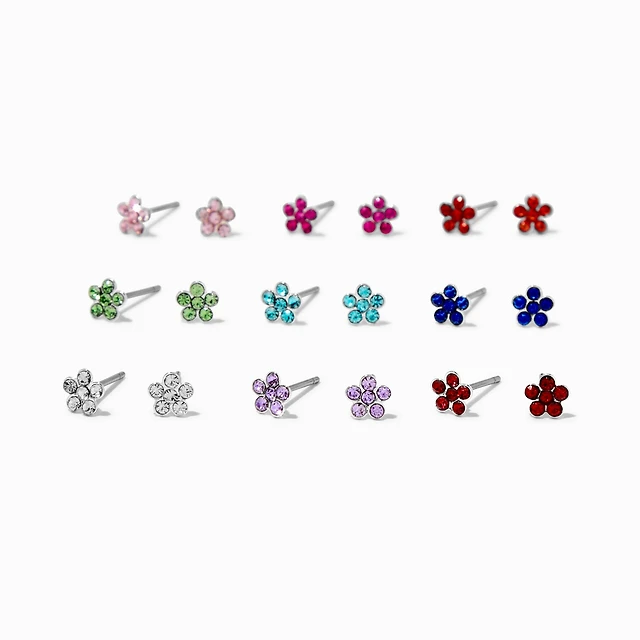 Multicolored Crystal Flower 4mm Stud Earrings - 9 Pack