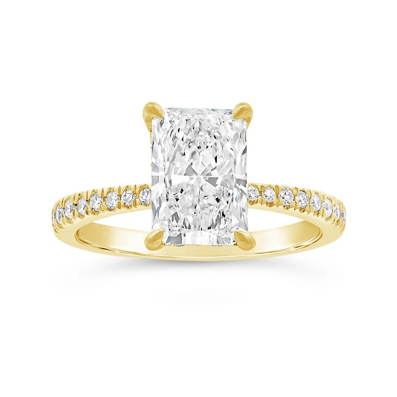 This elegant ring features a 2.5 ct radiant-cut lab-grown diamond as its centerpiece, offering exceptional brilliance and fire. A shimmering pavé diamond band adds extra sparkle, bringing the total weight to 2.75 CTW. Crafted in polished 14K yellow gold, it combines timeless beauty with sustainable luxury. Perfect for engagements, anniversaries, or any occasion worth celebrating.