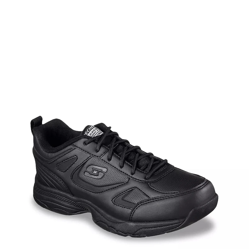 Ideal for professionals working in hazardous environments, these women's Skechers black Dighton - Bricelyn sneakers in wide width are EH Safe tested ASTM F2892-11 to prevent slipping on all surfaces. Made using a leather upper, these sneakers feature tiny perforated panels on the vamp, a Relaxed Fit design for an optimal fit, lace-up closure, a padded collar and tongue, fabric lining, a detachable Memory Foam insole, a lightweight midsole and a slip-resistant rubber outsole for a solid grip.