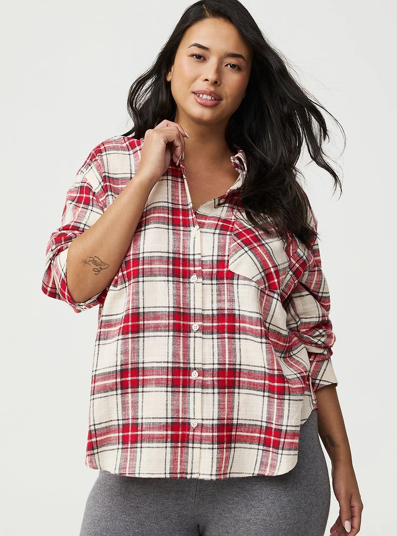 FIT Oversized fit. Measures 31'' from shoulder (size 2). MATERIALS + CARE Cotton flannel woven fabric. 100% cotton. Machine wash cold. Tumble dry low. Imported. DETAILS Collared neckline. Long sleeves with functional cuffs. Button front. Chest pocket.