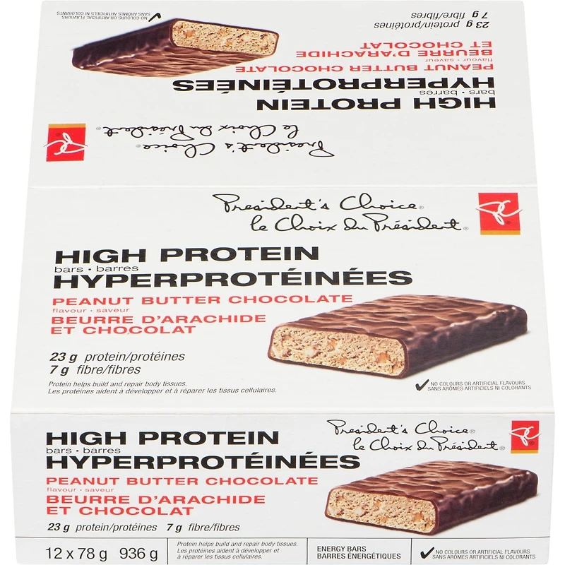 PC High Protein Bars are formulated to support your active lifestyle, delivering 23 grams of protein and 6 grams of fibre in every 78g bar. Ideal as a pre- or post-workout snack, this bar features a multi-source protein blend of soy, milk, and whey isolates. The Peanut Butter Chocolate flavour provides a satisfying taste while helping to fuel your body and aid muscle recovery.