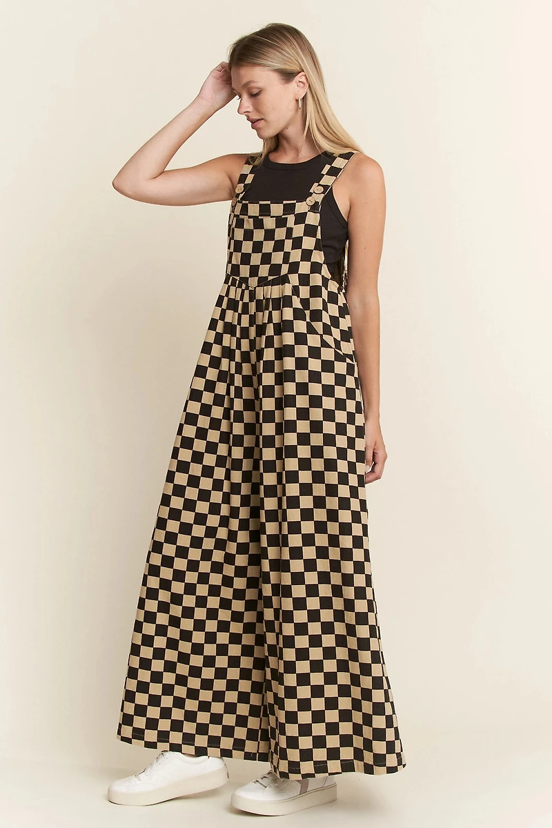 Plus Size Checkered Wide Leg OverallsMocha BlackAdjustable Straps Side PocketesFront Big PocketeAnkle Length100% Cotton Made In China