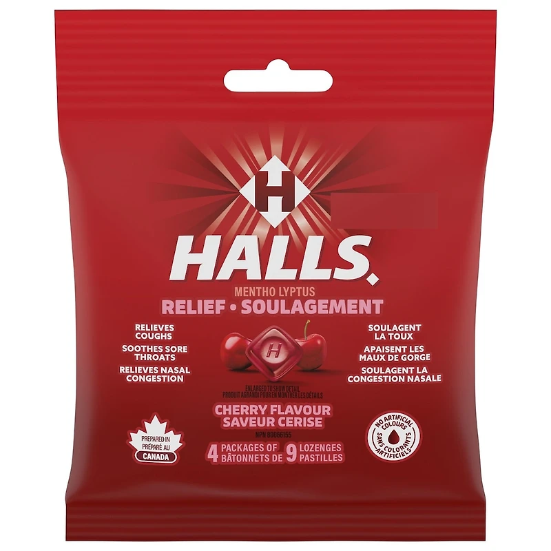 - MEDICINAL INGREDIENTS: MENTHOL 7.3 mg AND EUCALYPTUS GLOBULUS LEAF ESSENTIAL OIL 1.6 mg/LOZENGE. NON-MEDICINAL INGREDIENTS (ALPHABETICAL): FD&C BLUE NO. 2, FD&C RED NO. 40, FLAVOURS (CHERRY, MINT), GLUCOSE SYRUP, SOY LECITHIN, SUCRALOSE, SUGAR. CONTAINS: SOY.