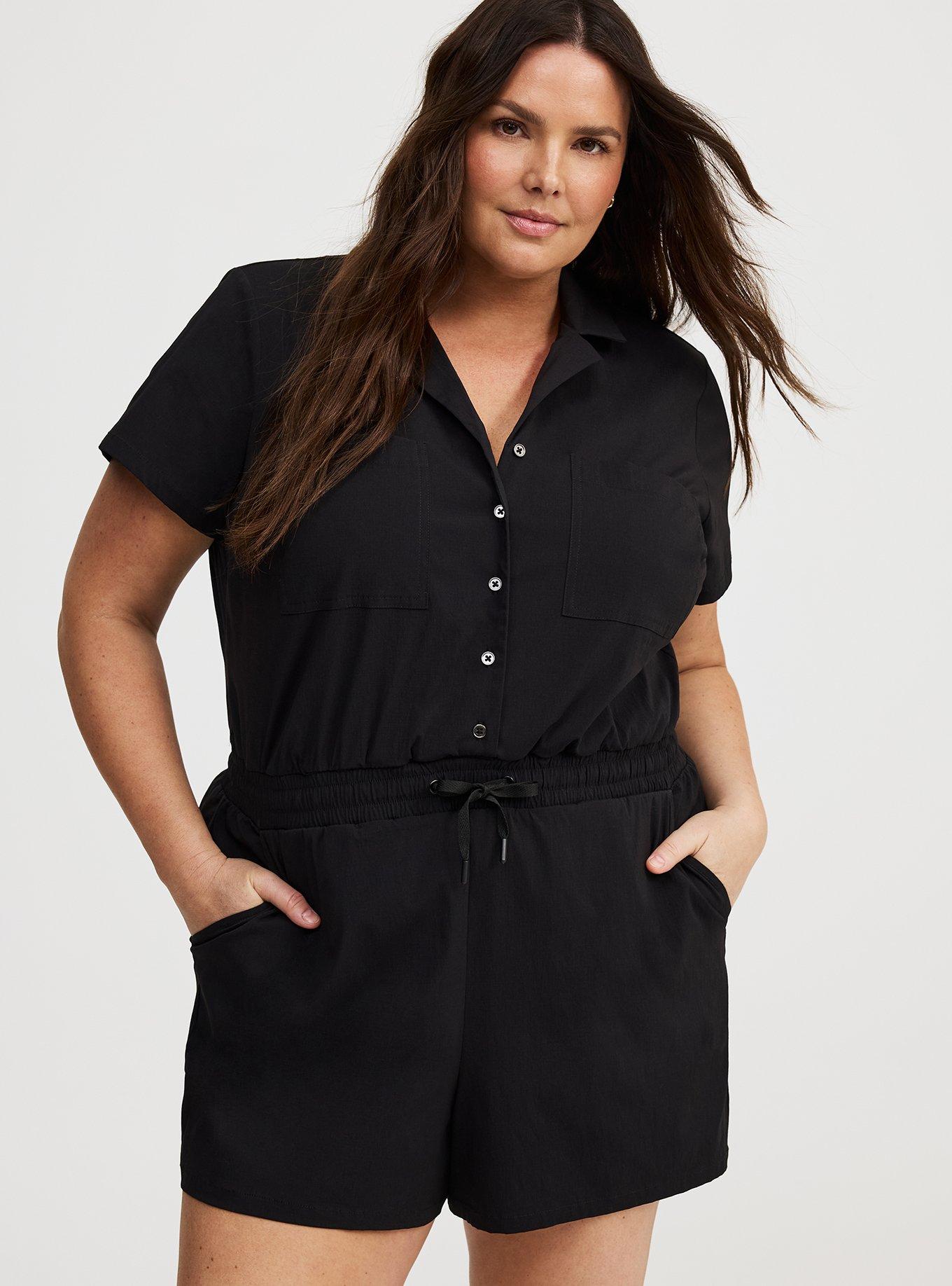 FIT Romper silhouette. Elasticized shirred waist with drawstring. 3'' inseam. MATERIALS + CARE Ripstop woven fabric: Your outdoor adventures start here! Perfect stretch, breathable and ready to go. Stretch level: Medium 2-way stretch. Breathable to keep you cool. Moisture-wicking finish keeps you dry. Water & abrasion resistant. 95% nylon, 5% spandex. Machine wash cold. Tumble dry low. Imported. DETAILS Collared neckline. Button front. Short sleeves. Front and chest pockets.