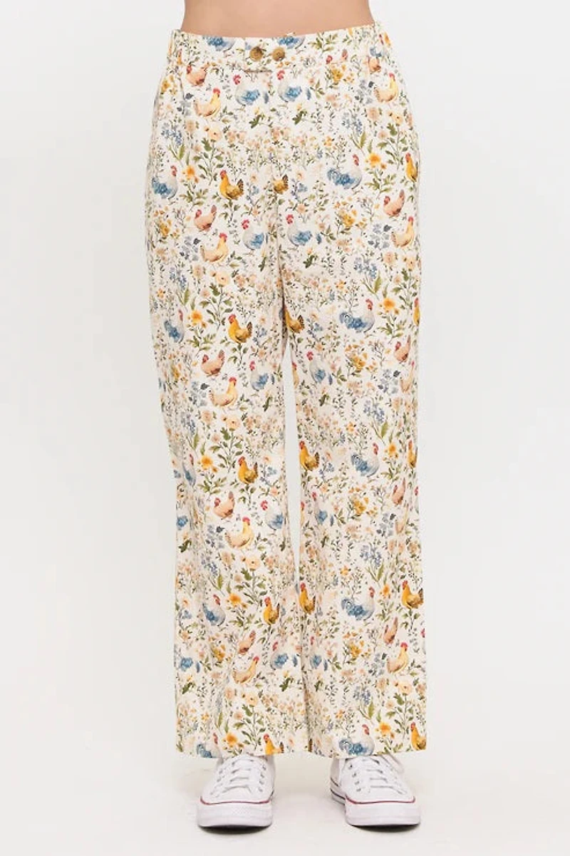 Rooster And Floral Print Wide Leg PantsPartical Elastic WaistbandTwo Front Button Closure100% Cotton