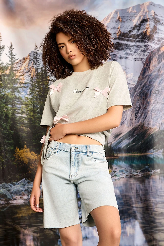 Ardene Oversized Graphic T-Shirt with Bow in Light | Size | Polyester/Cotton