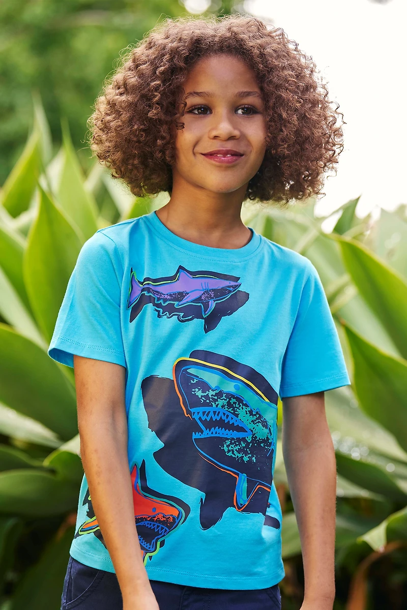 The Sharks Kids Tee is ideal for summertime adventures. Made from lightweight and breathable cotton, it keeps kids cool and comfortable. The bold shark print brings a fun and vibrant touch to their look. Whether they're exploring the outdoors or soaking up the sun in the garden, it's the perfect blend of comfort and style for every young explorer.