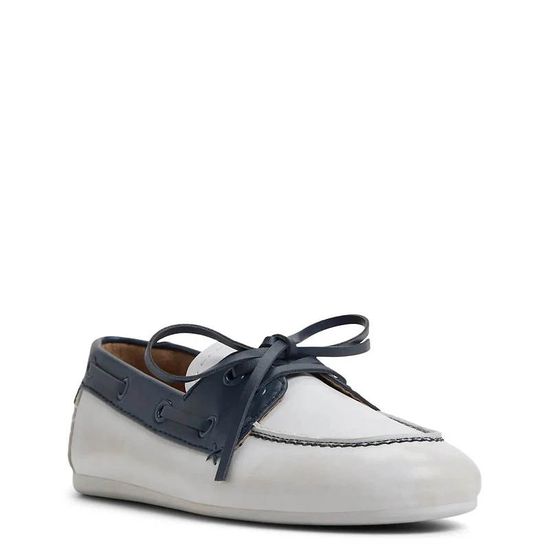 Add preppy or nautical flair to your casual outfits by choosing these Call IT Spring Shelly white/navy boat shoes. Made of synthetic upper, these 100% Peta-Approved Vegan shoes have a round moc toe and lace-up closure. The B.E.D Foam insole made of 30% post-consumer waste offers sustainable cushioned comfort and enhanced airflow, while the rubber outsole lends reliable traction.