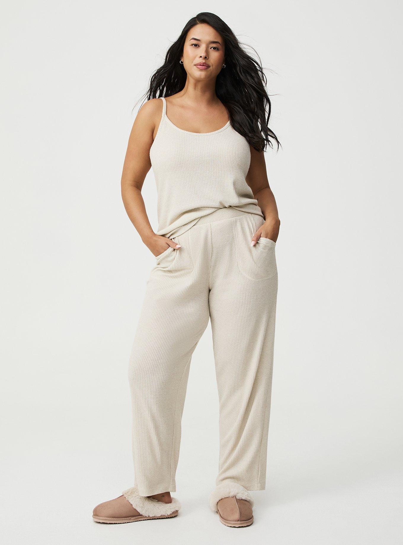FIT Straight leg. Measures 27'' inseam (size 2). MATERIALS + CARE Sleep shimmer rib knit fabric. 46% rayon, 25% polyester, 10% nylon, 9% metallic fiber. Machine wash cold. Line dry. Imported. DETAILS Encased elastic waistband.