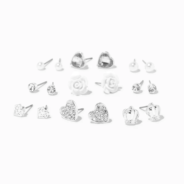 Silver Crown Heart Rose Stud Earrings - 9 Pack
