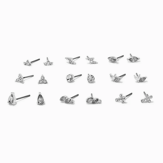 Silver-tone Crystal Cross Mixed Stud Earrings Set - 9 Pack