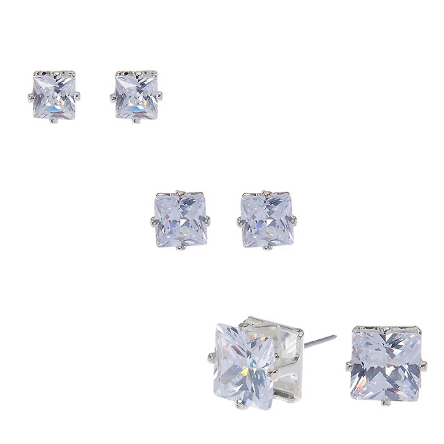 Silver-tone Cubic Zirconia 5mm, 6mm, & 7mm Square Stud Earrings - 3 Pack