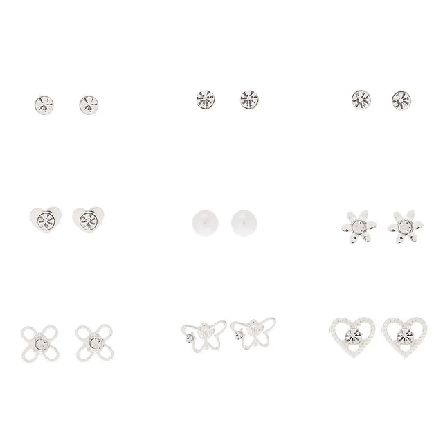 Silver-tone Embellished Spring Mix Stud Earrings - 9 Pack