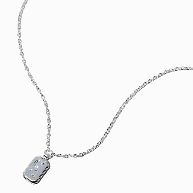Silver-tone Mini Etched Moon & Stars Square Pendant Necklace