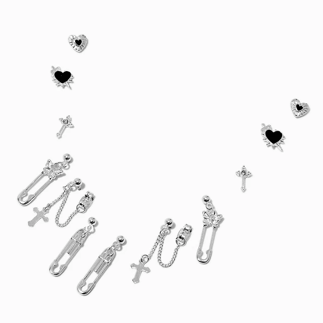Silver-tone Safety Pin Grunge Earring Stackables Set - 6 Pack
