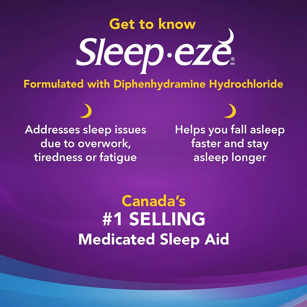 • • Sleep-eze® Extra Strength Nighttime Sleep Aid • Sleep well tonight... feel alert tomorrow. • 50mg diphenhydramine hydrochloride Capsule. • 20 coated caplets. • Safety sealed.