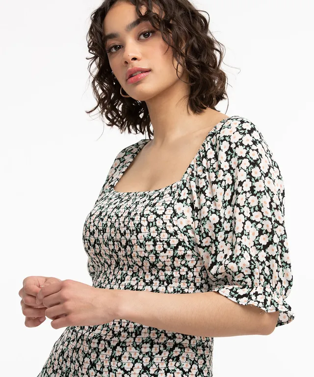 Ardene Kids Printed Smocked Puff Sleeve Top in Dark Blue | Size | Polyester/Spandex