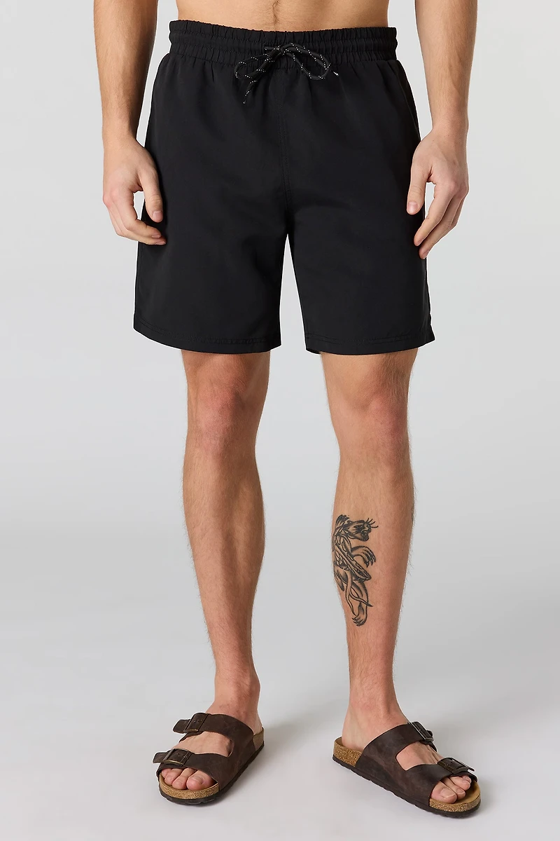 This swim short features boxer liner, drawstring waist, and slide-in pockets.