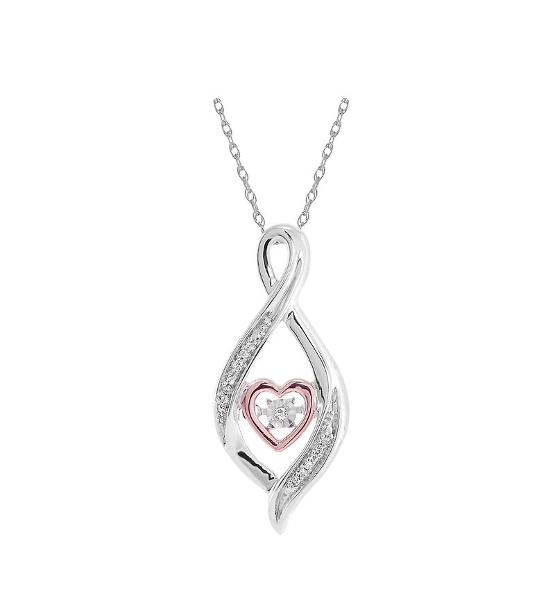 Show her that your love is forever with this Infinity Dancing Diamond heart pendant. Suspended from an 18" sterling silver chain, this artfully crafted pendant boasts a 0.03ct centre diamond that dances with her every movement. Created in Sterling Silver and 10kt rose gold, this is the perfect gift for your love.