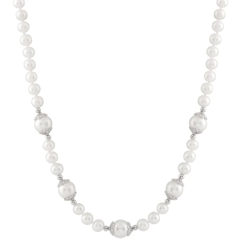 An 18-inch sterling silver necklace adorned with a range of 6-12mm freshwater pearls is a graceful embodiment of natural beauty and elegance. The varying sizes of the pearls add depth and dimension to the piece, creating a captivating visual allure. With its classic length, this necklace elegantly drapes along the neckline, offering a versatile and sophisticated accessory that effortlessly enhances any ensemble. A celebration of the pure, organic beauty of freshwater pearls, this necklace exudes timeless charm and refined grace.