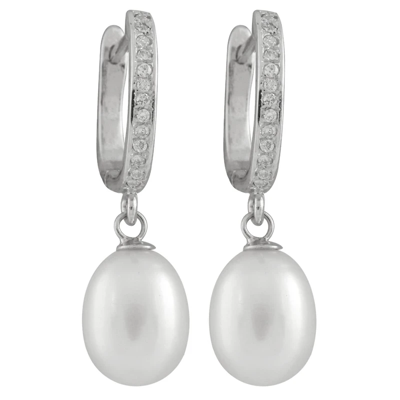 Sterling Silver 8-9mm White Freshwater Pearls & Cubic Zirconia Earrings