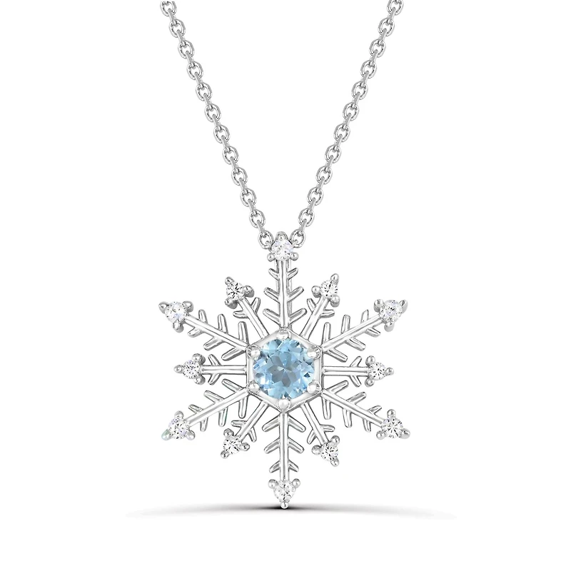 This icy-cold snowflake will warm even the coldest hearts! Crafted in sleek sterling silver, this festive flake is adorned with a shimmering topaz core and created sapphire accents. The pendant dangles from an 18’ chain with secure clasp.