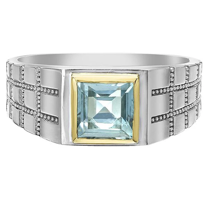This bold and brilliant blue topaz ring is crafted in lustrous sterling silver and accented with a 10K yellow gold bezel. A style with a modern flair, this gorgeous gemstone ring is sure to make a standout addition to any jewellery collection.