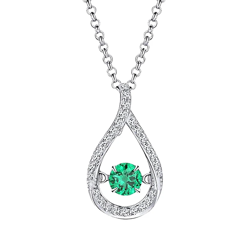 A teardrop pendant is adorned with round sparkling cubic zirconia in this dazzling dancing pendant. The centre enchanting created emerald stone moves, catching light from every angle. The pendant sways from an 18-inch chain with secure spring clasp.