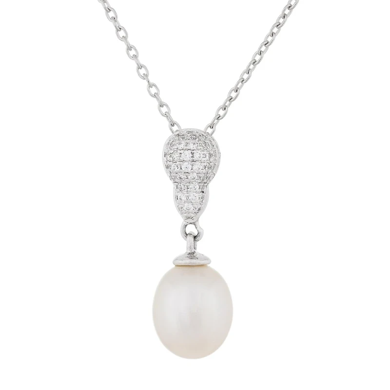 An 8-9mm white freshwater pearl pendant with cubic zirconia accents in sterling silver rhodium plated