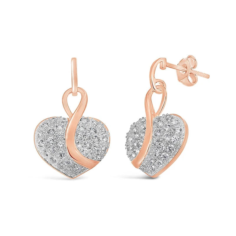 Sterling Silver Rose Plated Cubic Zirconia Sweep Heart Dangle Earrings