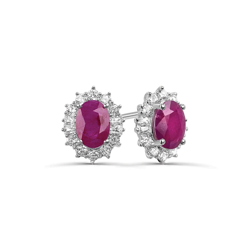 Add a pop of vibrant colour and timeless elegance with these stunning earrings. Featuring rich, fiery rubies at the center, each stone is surrounded by a halo of sparkling white zircon stones, creating a striking contrast that catches the light from every angle. Crafted from polished sterling silver, these earrings offer a sophisticated design that’s perfect for both special occasions and adding a touch of luxury to your everyday look.
