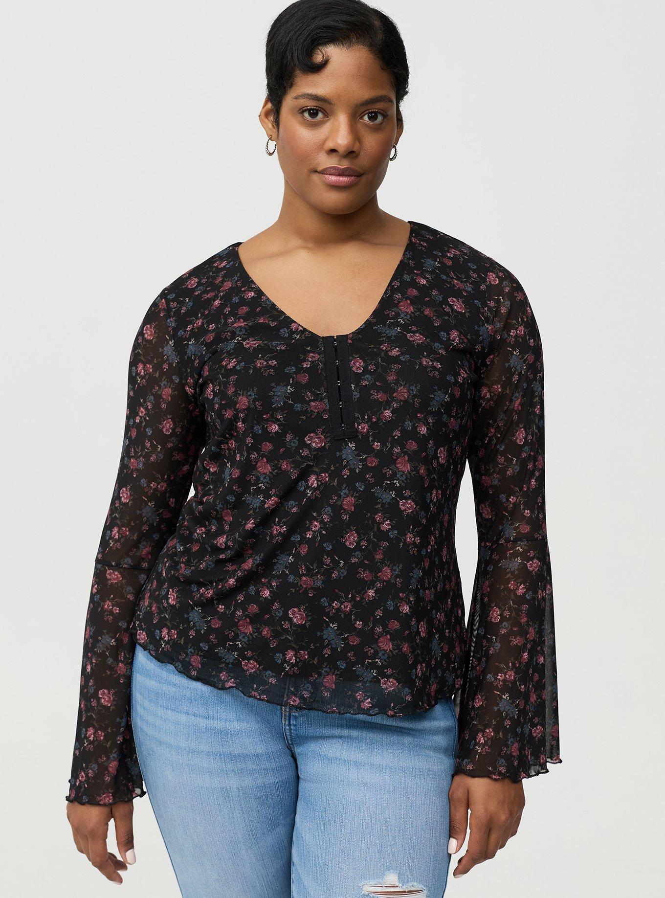FIT Measures 28'' from shoulder (size 2). MATERIALS + CARE Mesh knit fabric. 90% nylon, 10% spandex. Machine wash cold. Tumble dry low. Imported. DETAILS V-shaped neckline. Long bell sleeves. Hook-and-eye front detail.