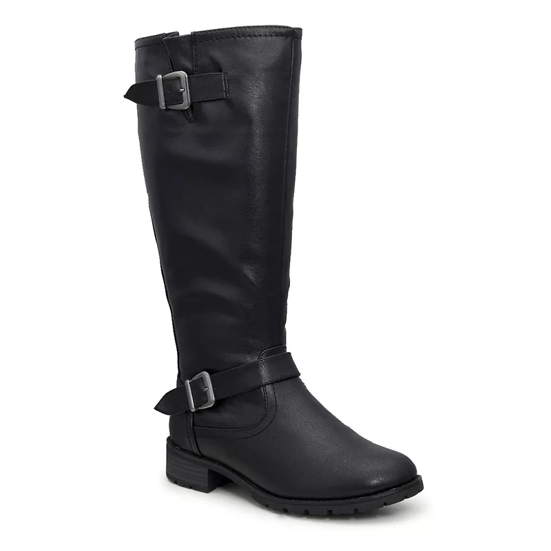 Maximum convenience and practical fashion is what you get with these women's Taxi Tara wide calf wide width black fashion boots. In a tall shaft profile, these knee-high boots boast of outside buckled strap accents, full-length and partial zip closure on the inside, plush padded footbed and supportive sole with a stacked block heel.
