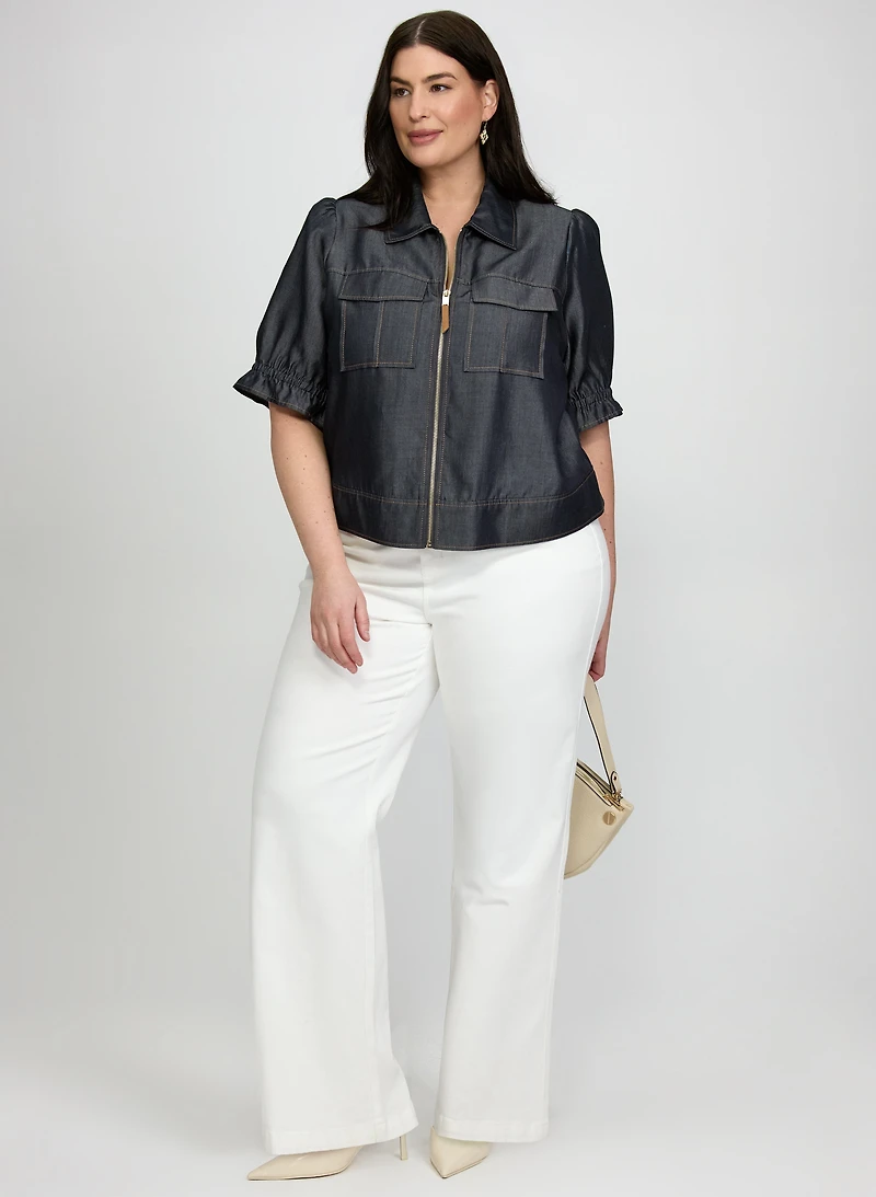 Tencel-Denim Short Sleeve Jacket & Braided Waist Trim Wide-Leg Jeans