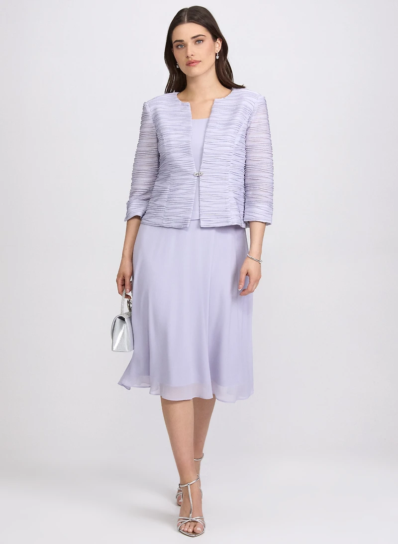 Perfect for evening events or special occasions, this set brings shimmer and sophistication to your wardrobe. Style with delicate accessories.Jacket Rhinestone embellished closure Wave-effect with glitter detailing 3/4 sleevesDressScoop neck SleevelessLayered ChiffonLined Highest shoulder point: 42"