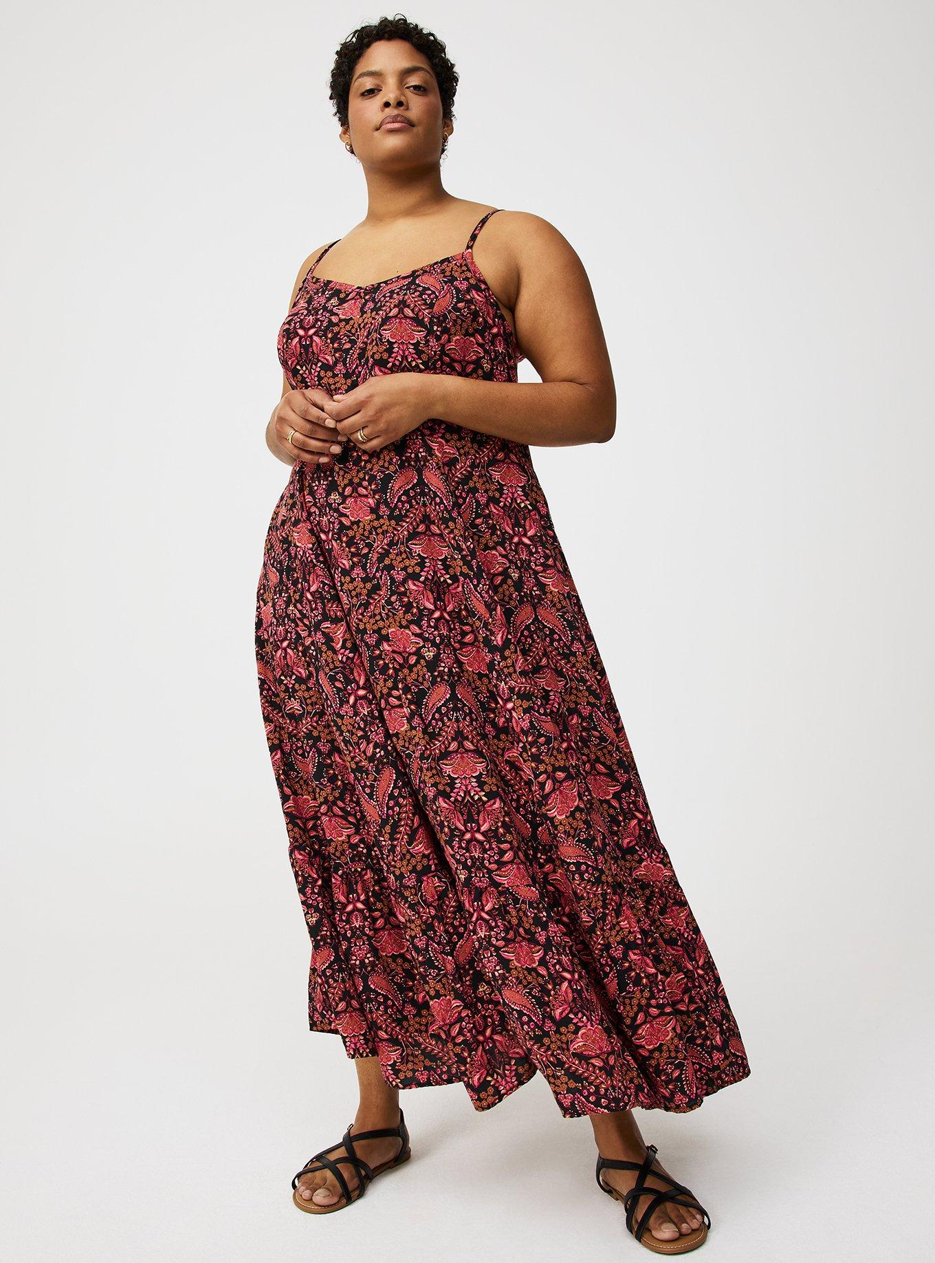 FIT Measures 56'' from shoulder (size 2). MATERIALS + CARE Challis woven fabric: Your favorite easy-but-polished fabric. Stretch level: None. 72% viscose, 28% lyocell. Machine wash cold. Line dry. Imported. DETAILS V-shaped neckline. Sleeveless. Adjustable straps. Functional pockets. Tiered skirt.