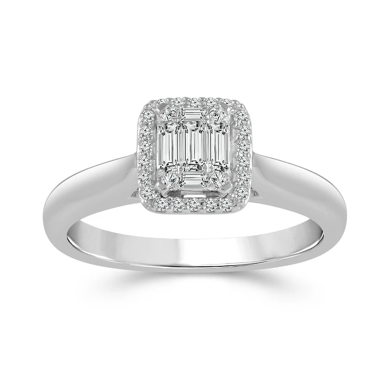 Celebrate your love with this beautiful .25ctw bridal ring from the Times Square collection. Featuring baguette and round diamonds at its centre, this ring shines in 14k white gold.