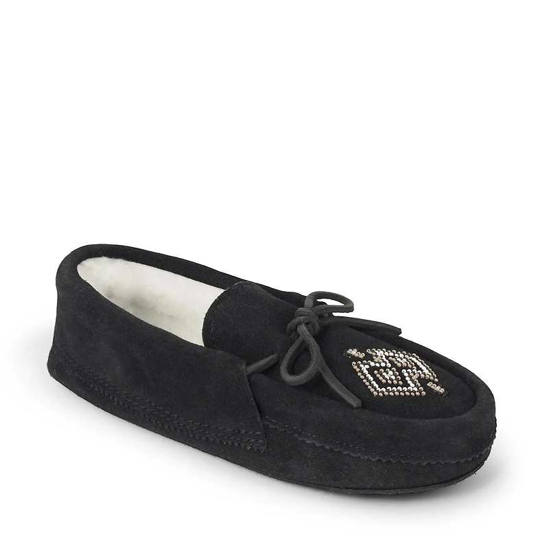 The Tipi Tooneu Slipper brings meaningful design to a cozy favourite, featuring beadwork by South Slavey artist and Fort Nelson First Nation member Anne Bell. Diamond shapes and arrow motifs reflect themes of reflection, choice, and the many paths we walk, offering quiet symbolism in a soft, wearable design. Crafted for easy slip-on comfort with a warm fleece footbed and soft suede upper, Tipi Tooneu blends comfort, craftsmanship, and story in a timeless indoor silhouette made for slow, grounding moments.