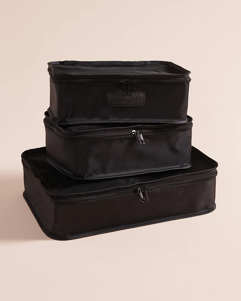 - 3 packing cubes with mesh top panel making it easy to identify the contents and 2-way zipper closure