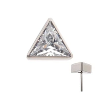 Titanium Threadless With Bezel Set CZ Triangular Shape Top. Manufactured Out Of High Polish Implant Grade Titanium. To Secure The Inside Bar Or Base, Add A Slight Bend To The Pin By Simply Inserting The Pin Halfway And Pushing The Top To One Side. Gem size: 4x4mm. Pin Gauge: 25g Fitting All Sizes Of Pins And Bases In The Invictus Threadless Body Jewelry Line.