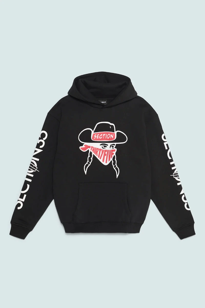 The Banditos Hoodie is a unisex pullover sweatshirt with original artwork created and designed by the Section 35 team. Unisex pullover hoodie Based on men's sizing Oversized, relaxed fit Fleece lined hood Drop shoulders Ribbed cuffs and hem Screen printed chest & arms 80% cotton, 20% polyester Section 35 is an Indigenous owned and operated label based in unceded Coast Salish territory. Their goal is to create and promote Indigenous art, culture and lifestyle through streetwear. The brand’s name is inspired by Section 35 of the Canadian Constitution, which recognizes and affirms Indigenous rights.