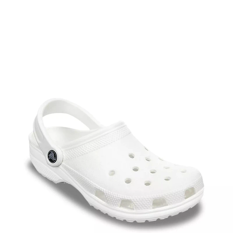 Make an iconic casual statement when donning the unisex white Classic Clog by Crocs. Made with Croslite™ upper, these clogs are designed with ventilation ports at the forefoot for breathability. These water-friendly sandals are made with a Croslite™ EVA upper and feature a heel strap for a precise fit, fully molded Crocs Croslite™ cushioning for extra softness and rebound, and a lightweight, non-marking outsole for enhanced grip.
