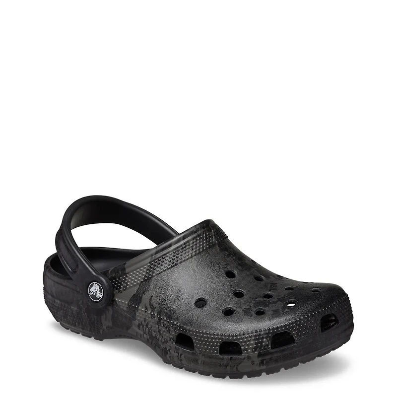 Step into all-day comfort with these Crocs Classis Veil Tac black clogs. Designed with a fully molded Croslite™ material upper, these clogs offer a soft, supportive fit that moves with you. Water-friendly clogs have ventilation ports that enhance airflow for breathable comfort, while quickly draining water and debris. The convertible heel strap adjusts to provide a secure or relaxed fit. With plush Croslite™ foam cushioning and Iconic Crocs Comfort™, these clogs deliver 360-degree flexibility and lightweight support.